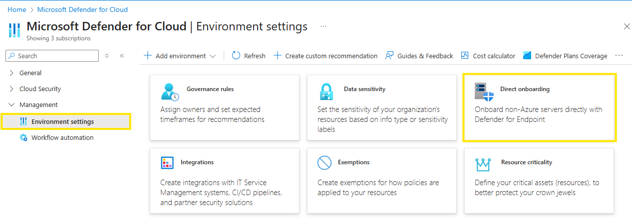 In the Defender for Cloud menu, select Environment settings.